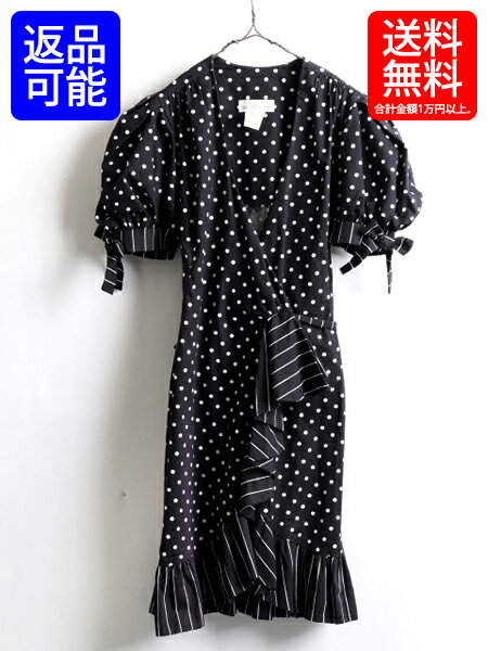 80's USA製 レディース ■ ラップ ワンピース フリルワンピース ドット 半袖 ドレス 水玉 (女性 6 M程) 膝丈 黒 中古 パフスリーブ Vネック| ワンピース古着 アメリカ製 シンプル 総柄 ワンピ 前開き Dress 古着 ビンテージ ミモレ丈 アンティーク コットン ひざ丈 腰リボン