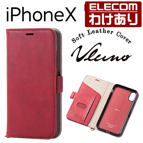 【訳あり】エレコム iPhoneXS iPhoneX ケース Vluno 手帳型 ソフトレザーカバー 通話対応 ストラップリング付 レッド PM-A17XPLFYRD